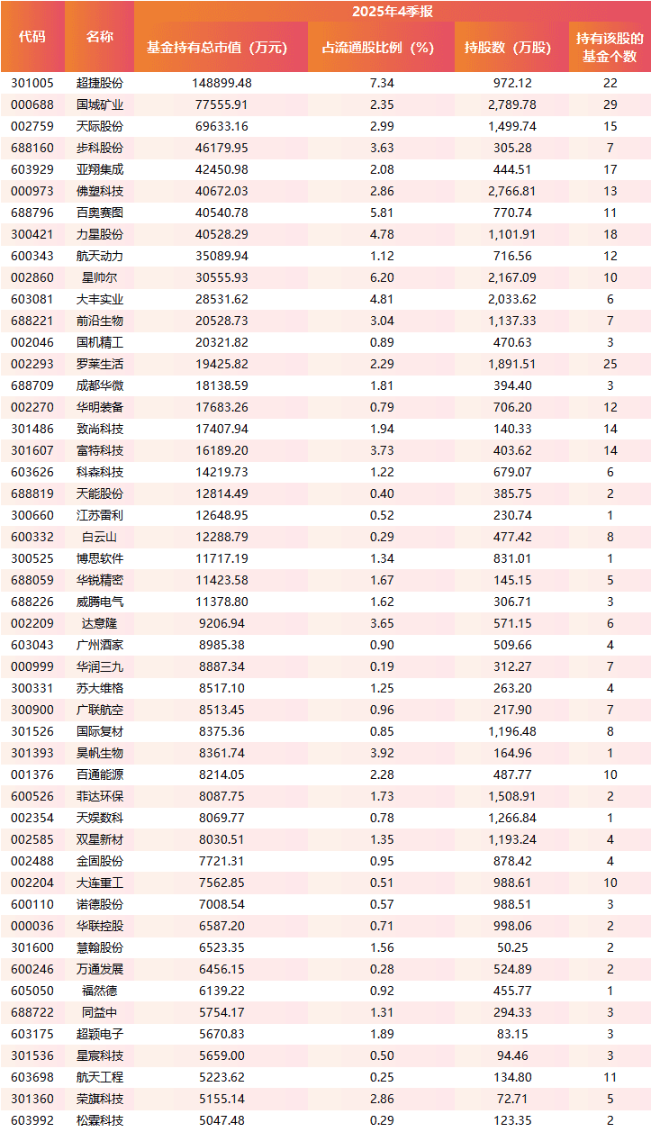 其中,超捷股份(22只基金持有,占流通股7.34%)、国城矿业(29只基金持有,占流通股2.35%)等个股在新增标的中关注度较高,可能成为机构下一阶段的布局重点。