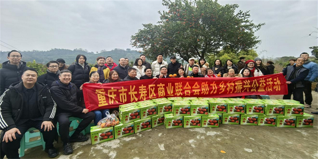 消费助农振兴公益活动现场岁末冬阳暖,湖畔果香浓2026年1月22日下午重庆市长寿区商业联合会党支部书记、会长车臣飞带领秘书处一行8人,在长寿湖镇响塘村与重庆市商业联合会共同举办了消费助农振兴公益活动全市商务行业20余个商协会的代表参加此次活动。
