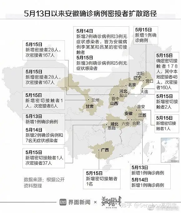 目前,北京、甘肃兰州、广西、辽宁大连、江苏淮安、湖北恩施、山西晋中、河北盐山县8地发现了此前安徽确病例的密切接触者共229人其中,大连178人,北京28人,兰州17人,河北盐山县2人,广西、江苏淮安、湖北恩施、山西晋中各1人。