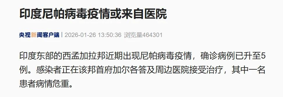 一年前实施的新修订《中华人民共和国国境卫生检疫法》已经将新冠、艾滋、尼帕病毒、寨卡、基孔肯雅热等纳入检测此前,2025年9月,韩国疾病管理厅已宣布将尼帕病毒感染列为一级传染病,系五年来首次增列本文内容来源自:央视新闻、新华社、中国网、中国青年报、人民网东南亚、环球时报、每日经济新闻、封面新闻。