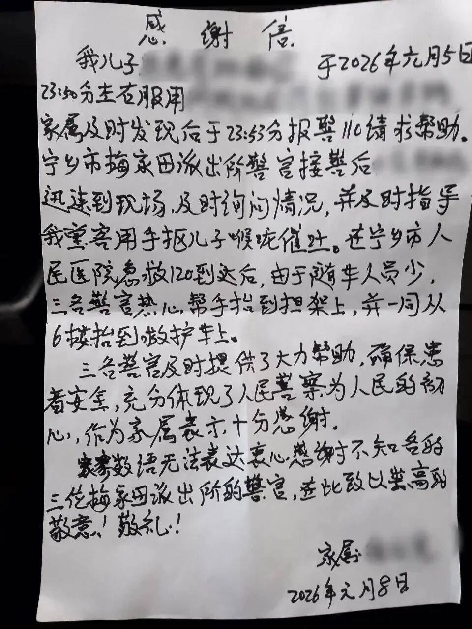 “衷心感谢不知名的三位警官在此致以崇高的敬意!”1月8日徐先生专程来到城郊派出所递上一封手写的感谢信只为向民辅警道一声“谢谢”一封手写的感谢信承载着群众对公安工作最真挚的认可城市很大,故事很多对于警察来说